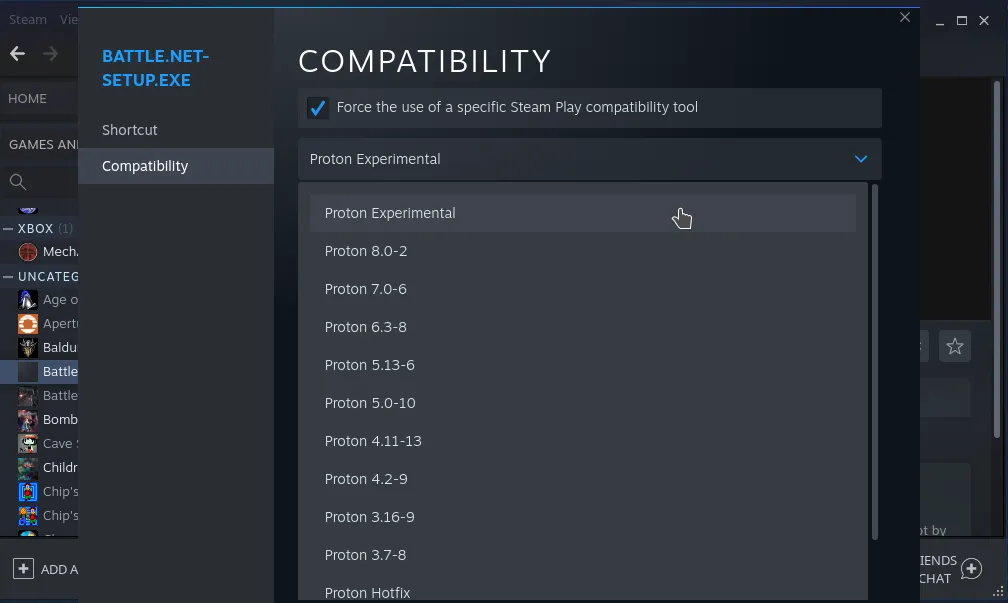 - Switch to the Tab “Compatibility” and select “Proton Experimental” as the compatibility tool